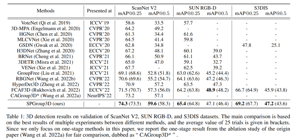 SPGroup3D는 indoor scene의 복잡한 기하학적인 구조를 파악할 수 있는 voting 모듈 (geometry-aware voting module)을 제안하며, 이는 voting 과정에서 각 proposal과 물체의 중심 사이의 상대적인 기하학적 구조를 활용하여 낮은 퀄리티의 proposal을 모델이 더 쉽게 필터링할 수 있도록 합니다. 그리고 Fig.1(c)와 같이 superpoint를 이용하여 현재의 그룹화에서 발생하는 문제를 해결하고자 하였습니다. superpoint는 instance aware한 로컬 단위이며, 유사한 semantic과 공간에 존재하는 인접한 포인트들로 구성됩니다. superpoint를 이용한 그룹화 모듈은 superpoint 어텐션과 superpoint-voxel fusion으로 이루어져 있습니다. 먼저 어텐션은 겹치지 않는 superpoint 사이의 interaction을 향상시키기 위해, superpoint-voxel fusion은 voxel과 superpoint 사이의 interaction을 위해 설계하였다고 하는데 이는 method에서 더 자세하게 살펴보도록 하겠습니다. 마지막으로는 다중 매칭을 사용하여 각 superpoint 기반으로 만들어진 물체 proposal과 GT를 비교하여 학습 동안에 positive 샘플을 선택합니다. 이러한 구조를 세 개의 indoor 데이터셋에서 실험한 결과 모두 SOTA를 달성하였다고 합니다. 여기서 본 논문의 main contribution을 정리하면 다음과 같습니다.