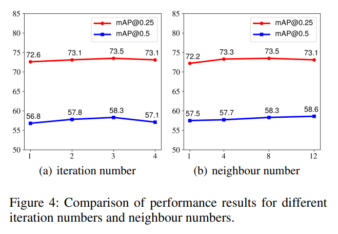 superpoint 기반의 그룹화 모듈에는 두 개의 하이퍼 파라미터를 조절할 수 있는데요, 모듈을 얼마나 반복할지에 대한 iteration과 이웃 포인트의 수인 k 입니다. Fig.4의 그래프를 보면 하이퍼 파라미터의 변화에도 성능 변동이 크지 않은 것을 볼 수 있습니다.