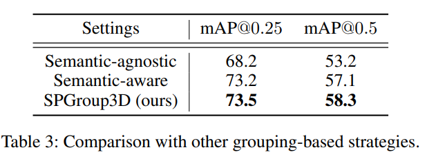 먼저 논문에서 제안한 3개의 contribution이 각각 성능에 미치는 영향에 대한 ablation study를 진행하였습니다. 1행의 베이스 모델은 VoteNet의 voting 방식을 활용하는 fully sparse convolution 모델 입니다. 먼저 1행과 2행을 비교하면, 본 논문의 geometry aware voting 결과를 그룹화 모듈과 다중 매칭 없이 다이렉트로 최종 proposal 형성에 사용합니다. 제안한 voting 모듈을 통해 베이스라인 모델 대비 꽤나 큰 폭을 가지며 성능 향상이 가능한 것을 확인할 수 있습니다. 또한 2행과 3행을 비교하면 superpoint 기반의 그룹화 모듈과 다중 매칭 방식을 차례로 추가할 때 마다 향상되는 성능을 통해 본 논문에서 제안하는 3개의 모듈이 모두 기존의 voting, 그룹화 방식을 개선하여 성능 향상에 영향을 주고 있다는 사실을 증명할 수 있습니다.