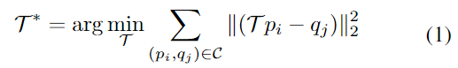 Unseen Object Pose Estimation은 학습 과정에 보지 못한 CAD모델과 RGB/Depth 이미지의 일부분 사이의 6D Pose를 추정하는 것을 목표로 하며, 본 논문에서는 RGB-D 데이터와 CAD 모델 사이의 학습된 descriptor를 매칭하여 Unseen 객체에 대한 pose를 추정합니다. Unseen객체의 CAD 모델의 point cloud를 P= \{ p_i ∈\mathbb{R}^3 |1 ≤ i ≤ n \}, depth 데이터에 표현되 객체의 일부분으로부터 구한 point cloud를 Q= \{ q_i ∈\mathbb{R}^3 |1 ≤ j ≤ m \}, 객체 영역에 대하여 crop된 RGB 이미지를 K라 할 때, 아래의 식(1)을 최적화하여 대응되는 두 point p_i ↔ q_i를 correspondence point 집합 \mathcal{C}에 추가하여 6D Pose를 추정합니다.