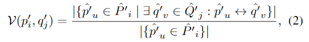 Cicle Loss를 적용하여 positive superpoint 쌍의 유사도는 최대화하고, negative쌍의 유사도는 최소화하도록 설계합니다. superpoint사이의 overlap \mathcal{V}는 아래의 식 (2)로 구할 수 있으며,