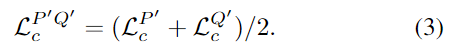 \mathcal{V}(p'_i,q'_j)>\tau_r(\tau_r는 설정한 임계치)를 만족할 경우 p'_i와 q'_i는 positive쌍으로 간주하며 Q'로부터 positive한 superpoint쌍을 샘플링하고, P'로부터 negative 쌍을 샘플링하여 overlab 가중치를 이용하여 P'에 대한 coarse-level superpoint Circle Loss \mathcal{L}^{P'}_c를 구합니다.(정확하게 loss에 대한 정의는 appendix에 있다고 하는데, 찾아봤지만 찾지 못했습니다.. overlap이 적을수록 loss가 커지도록 설계되었다는 정도로 이해하였으며, 해당 파트는 추후 업데이트 하도록 하겠습니다) Q’에 대해서도 동일하게 loss를 구하며 두 superpoints P’와 Q’ 사이의 loss는 아래의 식(3)으로 정의됩니다.