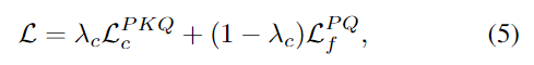 3D-3D 대응의 정밀도를 높이기 위해 CAD의 point cloud P와 depth의 point cloud Q에 fine-level matching loss를 적용하고, 일련의 decoder blocks를 이용하여 coarse-level의 superpionts P’와 Q’에서 더 dense한 P와 Q를 생성합니다. superpoint의 대응관계가 주어졌을 때, fine-level point feature는 각 superpoint로 할당되고, 해당 그룹사이의 유사도 행렬을 구합니다. 유사도행렬에 negative log-likelihood를 적용하여 fine-level matching loss \mathcal{L}^{PQ}_f를 구하고, 전체 loss는 아래의 식(5)로 정의됩니다.
