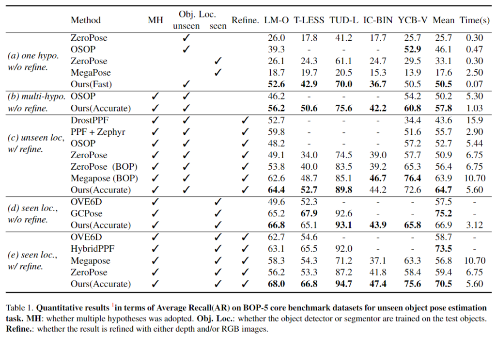 - (a) 추론 과정에 1개의 Pose 가설만을 이용하며 refinement 수행하지 않음(Zero-Pose, OSOP, MegaPose): 타 방식에 비해 속도가 크게 개선되었으며, 타 방법론과 비교했을 때 대부분 우수한 성능을 보이는 것을 확인하였습니다.