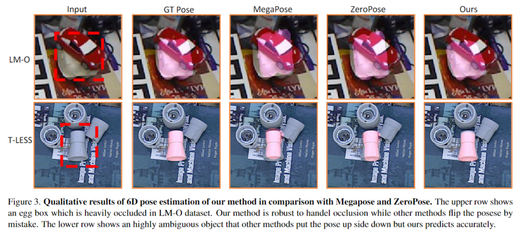 모델의 학습을 위해 MegaPose에서 제안하는 Google-Scanned-Object(GSO) 데이터 셋을 이용하여 학습을 수행하였으며, 해당 데이터는 800K개의 렌더링 이미지가 포함된 850개의 GSO object로 학습데이터가 구성되며, 나머지 94개의 객체에 대한 200K의 이미지가 평가데이터로 구성됩니다. Unseen object에 대한 평가를 위해 LM-O, T-LESS, TUD-L, IC-BIN, YCB-V라는 5개의 BOP core 데이터 셋을 이용하여 평가를 수행하였으며, 그중 LM-O를 이용하여 ablation study를 수행하였다고 합니다.