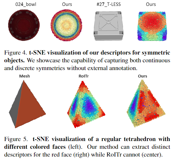 위의 [Figure 4]는 대칭 객체에 대한 descriptor를 t-SNE로 시각화 한 결과로, 연속적인 대칭(024_bowl)과 discrete한 대칭(#27_T-LESS)을 인식할 수 있음을 확인하였습니다. 또한, [Figure 5]에서 빨간 면과 흰색 면으로 이루어진 기하학적으로 유사하지만, 색상이 다른 객체에 대한 t-SNE 결과를 통해 저자들이 제안한 방식은 기하학적 유사성을 파악할 수 있는 rotation-invariant한 RoITr에 비해 texture 정보를 추가함으로써, 구조적으로 유사한 경우 발생하는 모호성을 해결할 수 있음을 보였습니다.