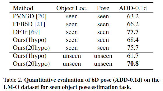 Table 2는 RGB-D 융합 방식의 효과를 입증하기 위해 LM-O에 대한 최신 방법론(PVN3D, FFB6D,DFTr)과 비교 실험을 수행한 결과로, 기존 방법론 대비 좋은 성능을 보였으며, 많은 pose 가설을 이용하는 DFTr과 비슷한 성능을 보이는 것을 실험적으로 확인하였습니다.