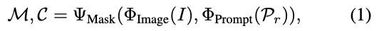 식으로 나타내면, 식(1)과 같이 나타낼 수 있습니다. 입력(이미지, 프롬프트)로부터 Mask를 생성하여 저희는 예측된 proposals \mathcal M, confidence scores \mathcal C를 얻을 수 있겠네요.