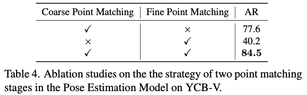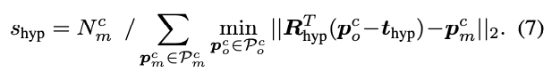 각 pose hypothesis R_{\scriptstyle\text{hyp}},t_{\scriptstyle\text{hyp}}(rotation, translation)에 대한 pose mathcing score s_{\scriptstyle\text{hyp}}을 식(7)과 같이 할당하여 matching score가 가장 높은 pose를 init pose로 선택하여 다음 Fine Point Matching 모듈에 전달합니다.