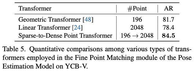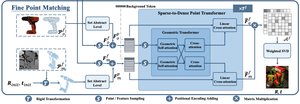 앞서 구한 coarse point matching 보다 좀 더 dense한 correspondence를 생성하기 위해서 앞서 feature extractor를 통한 결과 (F^{f}{o}, F^{f}{m} – f : fine)를 샘플링하여 사용하는 것까지는 동일하나, 여기서 Set Abstract 과정이 추가된 것을 확인할 수 있습니다. 해당 과정은 3D 모델에 대해 PointNet++ 모델을 사용하여 얻은 feature와 같이 Positional Encoding을 통하여 F^{p}{o}을 얻으며, 깊이 영상으로부터 물체에 대한 포인트 클라우드를 얻어 해당 포인트 클라우드에 init pose를 적용하여 얻은 포인트 클라우드로부터 feature extractor를 통해 얻은 결과를 positional encoding 한 F^{p}{m}결과를 사용합니다. 여기서도 동일하게 Background token이 들어가게 되는데요. 이렇게 dense한 feature를 사용하게 되면 transformer 연산은 계산면에서 상당한 cost가 발생하게 되는데요. 이러한 문제를 해결하기 위해 Sparse-to-Dense Point Transformer(SDPT)를 적용합니다. 부가적인 설명을 하자면, dense한 feature가 주어진 현재 상황에서 SDPT는 sparse하게 sampling을 하고 Geometry Transformer를 적용하여 상호 작용을 향상시키는 효과를 준 결과에 Linear Cross-attention을 적용하여 key, value에서 query로 정보를 확산시켜 주게 됩니다. 이러한 과정을 통해 Dense correspondence를 모델링한 이전과 동일한 과정을 통해 attention 행렬 \mathcal A^{f}를 얻어 weighted SVD를 통해 최종적인 R, t를 얻습니다.