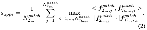 sematic matching을 통해 얻은 \mathcal T_{best}이 주어지면, patch embedding을 기반으로 appearance score s_{appe}을 측정합니다.