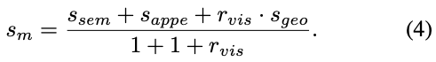 위 식(2)와 같이 \mathcal I_{m}T_{best}를 외관 측면에서 비교를 진행합니다. 이미지 내의 patch들에 대한 값을 모두 계산하여 최댓값을 취한 후, 모두 더하는 연산을 통해 semantic적으로는 유사하지만, 외관이 다른 물체를 구별합니다.