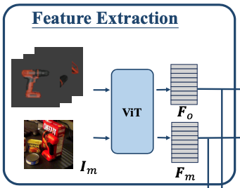 특징 추출 모듈은 proposal m과 주어진 물체 \mathcal O에 대한 포인트 클라우드인 \mathcal P_{m}, \mathcal P_{o}을 추출하는 데에 사용하게 되는데요. backbone으로 사용되는 ViT를 통해 F_{m}을 구할 수 있으며 물체 \mathcal O를 여러 카메라 뷰포인트에 대해서 렌더링된 template으로 구성하고 샘플링하여 \mathcal P_{o}를 생성합니다. 여기서도 동일하게 ViT를 태워 F_o을 형성합니다.