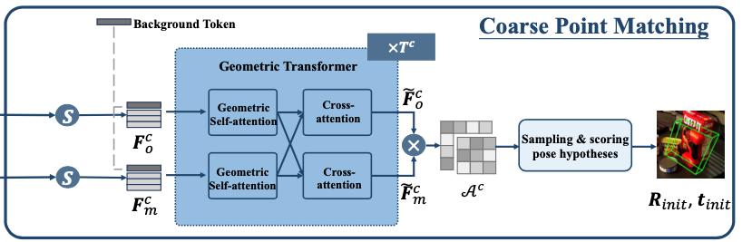 위 그림과 같이, 샘플링 된 두 개의 포인트 클라우드(F^{C}{o}, F^{C}{m} – C : coarse)로부터 learnable background token과 같이 각각에 대해 concat하고 이를 Geometric Transformer가 수행하게 되는데요. Geometric Transformer에서는 intra-point-set에 대한 feature learning을 위한 Geometric self-attention과 intra-point-set에 대한 correspondence modeling을 위해 Cross attention을 수행합니다. 이렇게 수행된 feature \tilde F^{C}{o}, \tilde F^{C}{m}에 대해 softmax 를 취하여 \mathcal A^c을 얻고, 확률 값을 가지는 행렬(attention matrix)을 만듭니다. 이를 통해, \mathcal P^{c}{m}\mathcal P^{c}{o} 간의 겹치는 점 사이의 일치 확률을 구할 수 있으며, 이는 point pair을 샘플링 하고 pose hypothesis를 계산하기 위한 분포로 사용할 수 있다고 합니다[이승현 연구원님이 리뷰한 SurfEmb – 3. From Embeddings to Pose 참고].