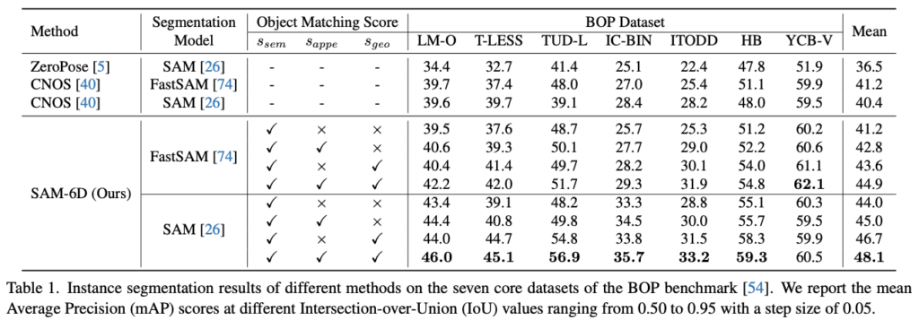 Novel object에 대한 segmentation과 같이 semantic한 측면에서의 proposal에 대한 점수를 측정하는 ZeroPose, CNOS와 이번 SAM-6D에서의 ISM(Instance Segmentation Model)을 비교합니다. 표(1)에 나와있듯이, FastSAM/SAM을 사용하여 특별한 재학습이나 fine-tune 과정 없이도 성능이 좀 더 좋은 것을 정량적 결과를 통해 입증합니다.