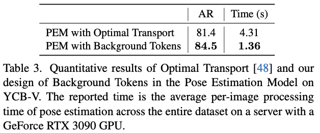 이번에는 Novel object에 대한 pose estimation을 수행하는 지금까지 현존하는 방법론들과 SAM-6D의 PEM을 비교합니다. 표(2)의 정량적 결과를 보았을 때, 시간적인 cost가 많이 드는 rendering-based의 refiner를 수행하는 MegaPose보다 PEM에서 다양한 mask 예측을 통해 얻은 결과가 더 좋은 결과를 낸 것을 확인할 수 있습니다. ISM의 결과로 나온 적절한 mask 예측이 다른 방법론의 mask 예측 결과보다 PEM의 최종 성능을 향상시켰으므로 ISM의 장점을 좀 더 잘 보였다고도 볼 수 있겠네요. PEM의 정성적 결과는 그림(1)의 (e)에서 확인할 수 있습니다.