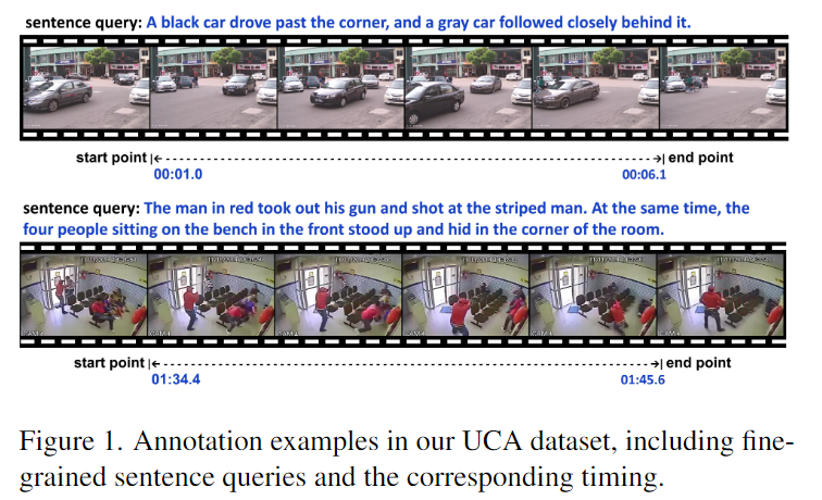UCA 데이터셋은 real-world 감시 영상으로 구성된 UCF-Crime 데이터셋을 기반으로 하고 있습니다. 기존의 13가지 카테고리로 분류를 하기 위해 구성된 데이터셋을 새로 annotation을 하는 것으로 기존의 퀄리티가 좋고 real-world 기반의 영상들을 활용했고 분류를 위한 카테고리가 존재하는 데이터셋이 아닌 영상의 구간을 세부화시키고 각 구간에 맞는 영상의 장면을 설명하는 자연어 문장 현태의 annotation을 새로 달아 구성한 데이터셋입니다. 구간별로 살세한 자연어 annotation이 존재하기에 TSGV, VC, DVC, MAD의 4가지 video 기반의 multimodal task에서 UCA 데이터셋을 활용할 수 있습니다.