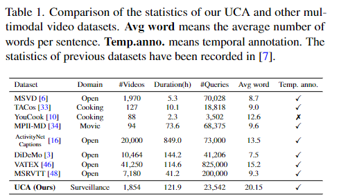 최근에 상당히 많은 수의 multimodal 비디오 데이터셋이 공개되었습니다. video caption, moment retrieval 등의 다양한 multimodal video task를 해결하기 위해 공개된 데이터셋들은 표1에서 UCA에 비교했습니다. 표1의 모든 데이터셋들은 높은 퀄리티의 영상들을 가지고 있으며, 디테일한 annotation을 가지고 있습니다. UCA와 다른 데이터셋과의 차이점은 바로 도메인입니다. UCA는 특별히 감시 상황을 위해서 준비된 데이터셋이라는 다른 데이터셋들과의 타별점을 가지고 있습니다.