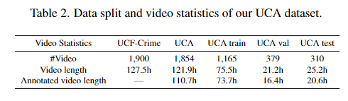 UCSD Ped1, UCSD Ped2, Avenue 등등의 기존의 감시 데이터셋들은 모두 현실 세계에서의 영상과는 다른다는 한계가 존재했습니다. 하지만 UCF-Crime 데이터셋은 실제 감시 영상을 기반으로 만들어진 데이터셋으로 1900개의 감시 영상과 13개의 실제 상황의 이상현상(Abuse, Burglary, Explosion 등)을 영상의 카테고리로 담고 있습니다. 하지만 이런 형태의 annotation은 moment retrieval이나 video captioning과 같은 더 복잡한 multimodal 학습 task에는 적합하지 않습니다. 이러한 문제를 해결하기 위하여 저자는 UCF-Crime 데이터셋에 새로운 annotation을 진행했습니다. 이를 UCF_Crime Annotation, 줄여서 UCA 데이터셋으로 명명했습니다. 기존의 SAVCHOI 데이터셋 또한 UCF-Crime 데이터를 활용하여 annotation만 다르게 했지만 300개의 영상만을 활용했을 뿐만아니라 temporal 정보 또한 많이 부족했습니다. UCA 데이터셋은 1854개의 데이터셋과 상세한 annotation을 했습니다.