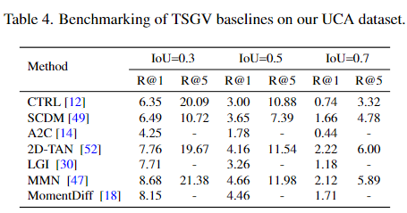 2015 ~ 2023년에 제안된 총 6개의 모델을 baseline으로 설정했으며, TSGV와 마찬가지로 전체적으로 낮은 성능을 보여주고 있습니다. 이또한 TSGV와 마찬가지의 이유로 annotation이 fine-grained하게 정교하고 상세하게 되어있다보니 생성된 자연어 문장과의 유사도가 비교적 낮에 측정되기 때문으로 생각됩니다.