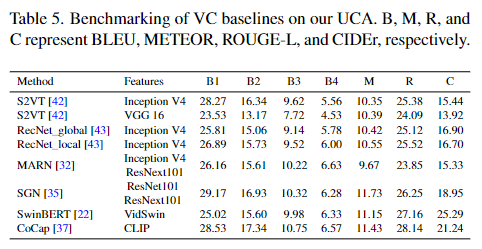 저자는 위 4가지 task를 모두 활용할 수 있으며 동시에 각 task별 현 sota 모델을을 벤치마킹하여 UCA 데이터셋의 baseline을 생성해 공합니다.