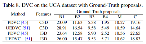 DVC는 기본적으로 VC와 똑같은 task이지만 추가적으로 captioning을 하는 영상 또한 모델이 찾는 다는 점에서 TSGV와 VC가 섞인 task입니다. 모델이 event가 있는 구간을 제안하고 그 event가 있는 구간에 대한 captioning을 진행합니다. 평가 방법으로는 proposal이 얼마나 정확한지는 recall과 precision을 사용하고 proposal된 영상 클립에 대해 생성한 자연어 문장이 얼마나 GT와 유사한지는 VC에서의 BLEU를 사용하여 평가합니다.