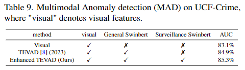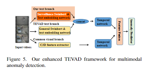 저자는 visual features, temporal features, caption features 총 3개의 features를 합하여 multimodal로 anomaly detection을 수행했고, 기존의 TEVAD에서 SwinBERT를 사용하여 text를 추가하여 활용했습니다.