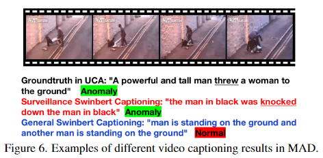 MAD는 기본적으로 이상탐지 즉, Anomaly Detection과 일치하지만, 기존의 영상만을 활용하던 task에서 벗어나 자연어까지 활용한다는 점에서 multimodal이 앞에 추가되어 있는 형태입니다. SwinBERT와 같은 video captioning 모델을 활용하여 영상에 대한 caption을 생성하고 영상과 생성된 caption을 모두 활용하여 이상탐지를 하는 task입니다. 따라서 영상의 feature와 caption을 통해 생성된 자연어의 feature를 활용하는 multimodal video task라고 할 수 있습니다.