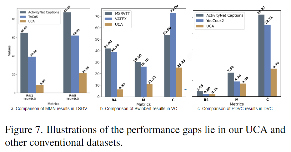 Figure 7.은 UCA와 다른 데이터셋들과의 baseline 모델의 성능들의 비교한 표입니다. UCA가 전체적으로 다른 데이터셋들에 비해 낮은 성능을 보입니다.