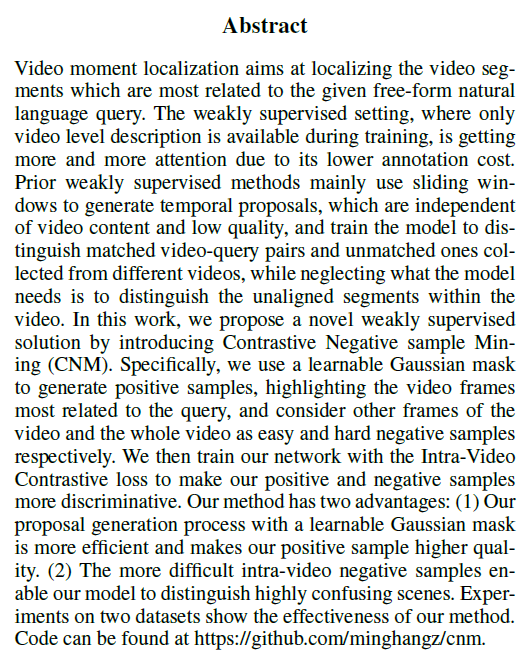 안녕하세요, 오늘의 X-Review는 22년도 AAAI에 게재된 논문 <Weakly Supervised Video Moment Localization with Contrastive Negative Sample Mining>입니다. Video Localization 관련된 논문에 북경대 Yang Liu 교수님이 굉장히 자주 보이네요. 교수님 때문에 읽은 것은 아니고, 현재 작업중인 ACM MM 논문의 Weakly supervised Temporal Action Localization(WTAL) task에서 활용중인 text 정보를 weakly-supervised 상황에서 어떻게 효과적으로 이용할 수 있을지에 대한 아이디어를 얻고자 읽었습니다. 22년도 방법론이다보니 그리 복잡하지는 않고, 오히려 간단한 모델링으로 temporal annotation이 없는 상황에서 당시 좋은 성능을 기록한 논문입니다.
