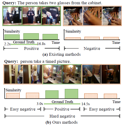 이제 저자가 이야기하는 기존 WS grounding 방법론들의 두 가지 문제점을 알아보겠습니다. 이전에 연구된 방법론들을 보면 비디오를 작은 단위(보통은 16프레임)인 segment 수준에서의 contrastive learning을 통해 쿼리에 상응하는 구간과 상응하지 않는 구간의 표현력을 분리하려는 시도들이 많이 있었습니다. 이를 위해 positive pair와 negative pair를 당연히 정해주어야겠죠. Grounding은 어디까지나 localization task로 하나의 untrimmed video 내 특정 구간을 다시 좁혀내야 하는 task입니다. 하지만 기존 방법론들은 contrastive learning을 수행할 때 negative pair를 단순히 배치 내 다른 비디오에서 가져왔다고 합니다.