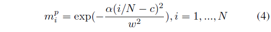 수식 (4)는 positive mask를 의미하고 분포 너비를 조절하는 하이퍼퍼라마터 \alpha{}와 앞서 구한 c, w로 비디오 내부 segment 별 positive score m_{i}^{p}를 얻을 수 있는 것입니다.