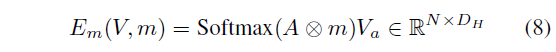 우선 attention map A = \frac{Q_{a}K_{a}}{\sqrt{D_{H}}} \in{} \mathbb{R}^{N \times{} N}을 얻어줍니다. 이를 바로 V_{a}에 곱하는 것이 아니라 그 사이에 mask m을 temporal 축으로 곱해줌으로써 다시 한 번 attention을 주는 것으로 이해하시면 됩니다. 이후 row-wise로 softmax를 적용해 encoder의 최종 출력을 아래 수식 (8)과 같이 얻습니다.