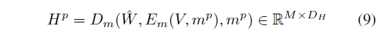 이제 E_{m}(V, m)과 마스킹된 텍스트 쿼리 값을 함께 reconstructor의 decoder D_{m}(\cdot{})의 입력으로 주어 복원을 수행하게 됩니다. 텍스트 쿼리의 마스킹은 전체 문장의 1/3을 랜덤하게 지우고 특히 명사, 동사, 형용사는 높은 가중치를 주어 지운다고 합니다. 이렇게 특정 단어들이 지워진 텍스트 쿼리의 GloVe feature는 \hat{W}로 표현합니다. 이를 이용해 positive mask m^{p} 기준의 reconstructed representation H^{p}는 아래 수식 (9)와 같습니다.