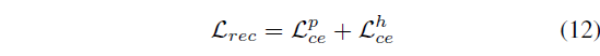 우선 reconstruction에 대한 최적화는 \mathcal{L}_{ce}^{p}, \mathcal{L}_{ce}^{h}만을 대상으로 진행합니다. \mathcal{L}_{ce}^{e} 또한 계산은 되지만 backward되지 않는 이유는, easy negative에는 정의 상 실제 상응 구간이 포함되지 않기 떄문에 정답 단어를 reconstruction하지 못하는 것이 맞기 때문입니다.