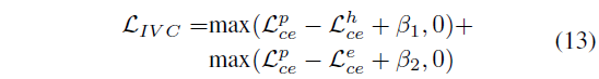 그렇다면 \mathcal{L}_{ce}^{e}는 어디에서 사용될까요? 이는 아까 저희가 정의한 수식 (7)의 관계를 만족시켜주기 위해 활용됩니다. 정답과 가장 많이 상응하는 구간일수록 마스킹된 문장을 잘 reconstruction할 것이라는게 가장 첫 번째 가정이었고, 그 가정에 따라 상응 구간 포함 정도를 기준으로 수식 (7)과 같은 관계를 정의했었죠. 저자는 방금 구한 각 mask의 CE Loss 들이 해당 관계를 유지하도록 설계해줍니다. 이것이 바로 저자가 제안하는 \mathcal{L}_{IVC}입니다. 이는 아래 수식 (13)과 같고, 식에서 \beta{}_{1} < \beta{}_{2}입니다.