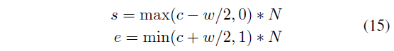 Positive mask를 통해 모델의 최종 예측을 만들어낼 수 있을 것으로 보이는데, 실질적으로 어떻게 하는지 알아보겠습니다. 이는 아래 수식 (15)와 같습니다. 예측한 c를 기준으로 w의 절반만큼을 앞뒤로 빼고 더해 시작과 끝 지점을 정해줍니다.