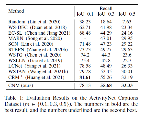 마지막 그림 3은 정성적 결과입니다. 베이스라인으로 삼은 SCN보다 정확하게 구간을 맞추고 있지만 마지막 예시의 경우 CNM이 문장을 잘 reconstruct 하기 위해 긴 구간을 예측으로 내뱉는 경향이 있다는 점을 본 연구의 한계점으로 지적하고 있습니다.