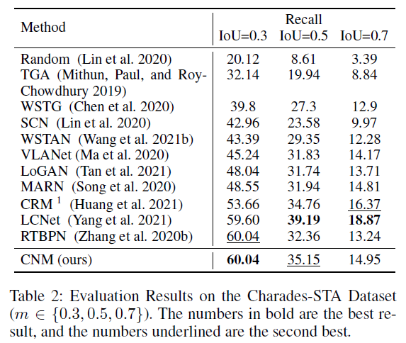 다음으로 표 2에서는 IoU=0.1을 제외하고 타 방법론들보다 성능이 크게 떨어지는 것을 볼 수 있습니다. 이에 대해 저자는, CNM이 reconstruction 기반으로 학습되어 문장을 잘 완성하기 위해 좀 더 긴 영역을 살펴보게 되었고, 이로 인해 긴 proposal을 출력으로 내뱉는 경향이 있었다고 합니다. 그러다보니 조금 더 정밀하게 맞춰야 하는 IoU=0.5, 0.7에서는 성능이 떨어진 것이라고 하네요. 참고로 Charades-STA 데이터셋의 평균 구간 길이는 8.1초로 평균 구간 길이가 24.6초인 ActivityNet Captions 데이터셋보다 짧아 이런 경향성을 보인다고 생각할 수 있습니다. AAAI와 같은 높은 학회에서 이 정도의 분석으로 낮은 성능 측면에서 문제되지 않을 수 있다는 점이 놀랍습니다.