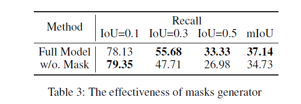저자에 따르면 여기서 CRM이라는 방법론과의 직접적인 비교는 fair comparison이 아니라고 하네요. CRM의 경우 학습 중 텍스트 쿼리 이외에 paragraph description annotation을 추가로 요구하기에 성능이 높은 것이라고 합니다. 표 1을 보았을 때 IoU=0.1 제외 SOTA를 달성했음을 알 수 있습니다. 0.1에서는 CRM을 제외하더라도 SOTA 성능이 아닌데, 이에 대한 분석은 따로 하고있지 않네요.