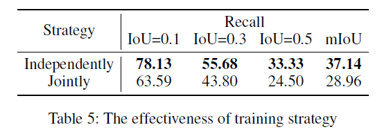 Mask generator를 제거한 뒤 기존의 sliding window 방식으로 대체하는 경우 성능을 살펴보겠습니다. 나머지 IoU를 기준으로는 압도적으로 높은 성능을 보여주지만 IoU=0.1 기준에서는 오히려 sliding window 방식이 더 높은 것을 볼 수 있습니다. 하지만 w/o Mask 방법론은 많은 window를 기준으로 연산량이 큰 NMS를 적용해야 하기에 효율성 측면에서 부족한 모습을 보입니다. 저자에 따르면 CNM은 비디오 당 inference 속도가 55.8ms, w/o Mask는 124ms라고 합니다. 두 배 이상의 빠른 속도로 높은 성능을 보여준다는 점이 설득력있게 작용한 것 같습니다.