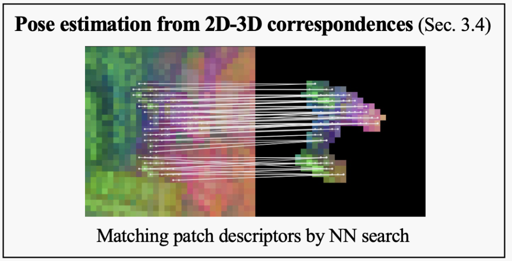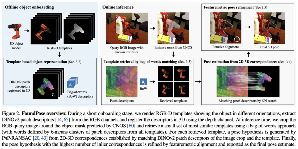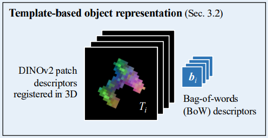 • DINOv2를 통한 patch descriptor를 이용하여 빠른 template retrieval은 강인한 2D-3D correspondecne를 생성함