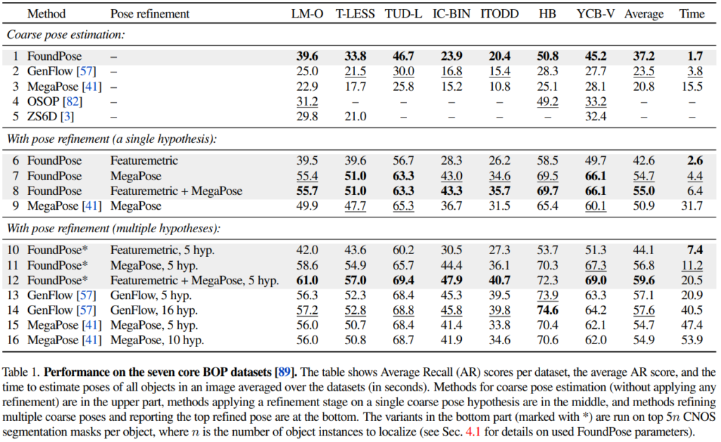 표(1)의 1, 6, 10행을 보았을 때 refinement 과정을 수행하게 되면 그만큼 속도가 느려지긴 하지만 기존의 방법론들보다 FoundPose가 우세한 것을 확인할 수 있습니다.
