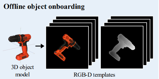 이번 FoundPose에서도 unseen 물체에 대한 6D pose estimation을 수행하는데요. 대상 물체에 대한 3D 모델을 사용할 수 있고, onboarding을 위한 cost가 제한이 되어 있다고 가정합니다. 이러한 가정은 large-scale의 데이터셋을 렌더링하고 신경망을 학습하기에는 충분하지 않은 상황을 제시하는 것으로 볼 수 있습니다. 이와 같은 제약적인 상황에서는 효율적인 onboarding 과정이 중요하겠네요.