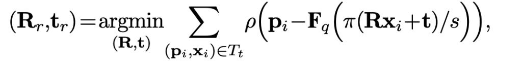 물체에 대한 pose는 이전에 생성된 2D-3D correspondence를 이용하여 추정할 수 있는데요. 2D-3D correspondence를 생성하는 과정은 PnP(Perspective-n-Point) 알고리즘을 통해 해결할 수 있으며 RANSAC을 통해 outlier를 제거하여 pose를 추정하게 됩니다. PnP 알고리즘을 적용하기 위해 최소 n=3부터 설정할 수 있는데, 저자는 무작위로 4개의 correspodences를 사용하여 pose hypothesis로 사용하였다고 합니다.