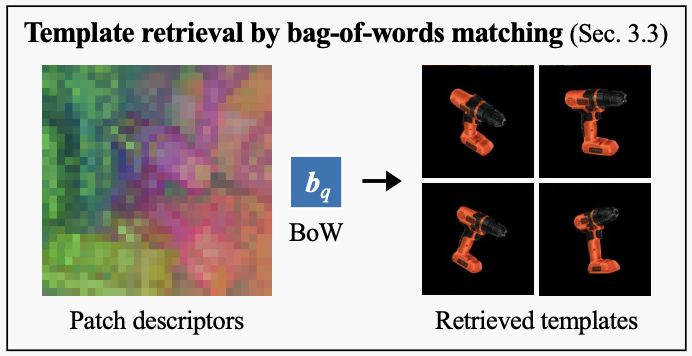 이전 방법론들과 또 다른 차이점을 보이는 것은 뽑은 descriptor를 Bag-of-words(BoW)를 이용한 image retrieval 방법론을 적용한다는 점인데요. inference 할 때 효율적으로 template retrieval이 가능하도록 하는 것을 목표로 하여 모든 template의 BoW descriptor를 사전에 계산해놓습니다. 유사한 특징들은 onboarding 과정에서 각 template에 대한 clustering을 수행하고 쿼리 이미지가 주어졌을 때 distance를 계산하여 매칭하기 위한 과정으로 이해하시면 되겠습니다. 즉, visual words를 물체의 모든 template에서 추출한 patch descriptor의 k-means cluster들에 대한 중심점으로 정의하는 것입니다.
