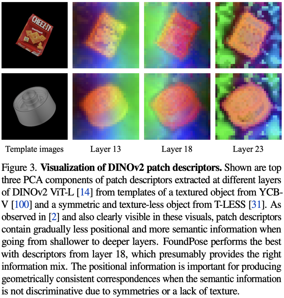 retrieval된 각 template과 patch descriptor(쿼리 이미지)와의 가장 가까운 거리에 있는 descriptor와 2D-3D correspondence를 생성하는 과정을 거치게 됩니다. 이러한 crop-to-template patch mathcing을 통해 2D-3D correspondence를 설정하는 것은 모든 template의 patch descriptor에 대해 일일이 매칭하는 것보다 훨씬 효율적인 방법입니다. 또한 template-based 방법론의 경우 일반적으로 비대칭 물체, 텍스처가 부족한 물체와 같이 challenge한 상황이 발생해도 어느정도 물체에 대해 대처가 가능하므로 효과적인 것을 보여주네요. 즉, 2D-3D correspondence에 대한 모호성을 candidate descriptor들을 single descriptor로 제한하여 semantic한 정보와 2D 위치 정보를 모두 포함하는 DINOv2의 중간 layer에서 patch descriptor를 사용하므로 제거할 수 있게 됩니다. 해당 위치 정보는 대칭이나 텍스처 부족으로 인한 semantic 정보가 차이가 없을 때 기하학적으로 일관성 있는 correspondence를 생성하는 데에 핵심적인 역할을 수행하게 됩니다. 이전 섹션에서 설명드린 순서를 정렬하는 과정에 있어 이러한 correspondence를 생성하면서 2차원의 위치 정보뿐만 아니라 공간적 정보(기하학적 요소)를 고려할 수 있다고 보시면 되겠습니다. 실험을 통해 FoundPose에 DINOv2를 적용하였을 때 layer 18을 사용하는 것이 positional과 semantic 정보를 가지는 것에 가장 적합한 것으로 사용하였습니다.