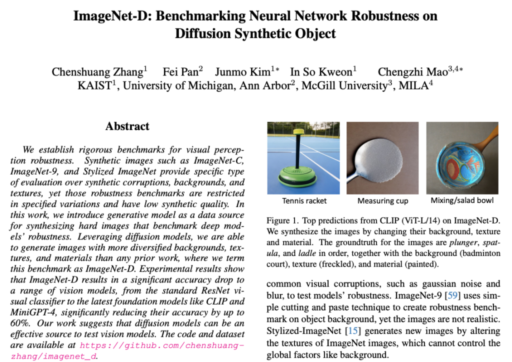 5 thoughts on “[CVPR 2024] ImageNet-D: Benchmarking Neural Network Robustness on Diffusion Synthetic Object