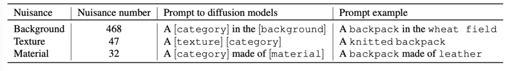 테이블 1은 저자가 사용한 프롬프트에 대한 예시입니다. 예를 들어, C가 Backpack일 때, 다양한 배경(예: 밀밭에 놓인 배낭), 소재(예: 니트 재질의 배낭), 질감(예: 가죽으로 만들어진 배낭)을 가진 배낭 이미지를 생성하였습니다. 그렇게 생성된 데이터의 GT는 C인 Category로 설정하였습니다.