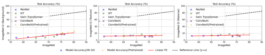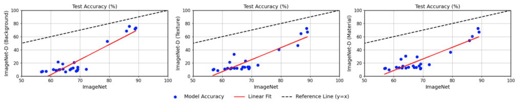 그림 8은 학습이 완료된 25개 모델에 대하여 두 가지 데이터셋(imagenet, imagenet-d)으로 평가한 정확도 추세를 나타낸 것입니다. 가로축은 ImageNet, 새로축은 ImageNet-D 입니다. 그 결과 모든 모델에서의 ImageNet-D의 정확도가 현저히 낮았습니다(점선으로 구성된 y=x 베이스라인 밑에 결과들이 분포함)